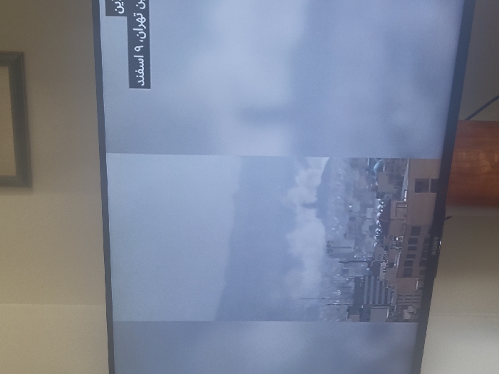 The image displays a Sony flat-screen television, powered on, within an indoor environment in London, United Kingdom. The television screen occupies the majority of the frame, showing what appears to be a news broadcast or documentary. The on-screen content is a hazy, wide shot of a cityscape featuring numerous buildings of various sizes, with prominent mountainous terrain in the background. The scene is significantly obscured by atmospheric haze, fog, or smoke. Faintly discernible atop a distant elevated point is a large, potentially conical or spired structure. In the upper right corner of the screen, dark grey overlay boxes contain white Persian (Farsi) text, which includes "تهران، ۹ اسفند" (Tehran, 9 Esfand), identifying the depicted city as Tehran and indicating a date. The room containing the television has a light-colored wall, upon which a dark-framed picture is partially visible in the upper right background. A cylindrical wooden object is situated beneath the TV to the right, with black cables visible behind it. No individuals are present in the image.