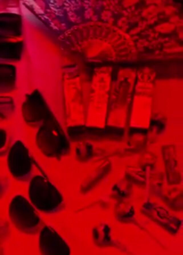 white table surface illuminated by a red light. Scattered on the table are multiple pairs of sunglasses of varying styles, four tall, narrow boxes bearing the label "MESK" visible on at least one, a folding fan with a dark floral pattern, and several lollipops with white sticks. A small white lamp-like object is visible in the upper left corner. There is indistinct background noise of multiple people talking.