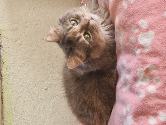 - "A domestic long-haired cat, exhibiting a dilute calico or tortie pattern with predominant greyish-brown fur, lighter cream facial markings, and green eyes, is depicted resting on a pink fleece blanket adorned with white paw print patterns" by FM-JBLtz2, licensed under CC BY 4.0