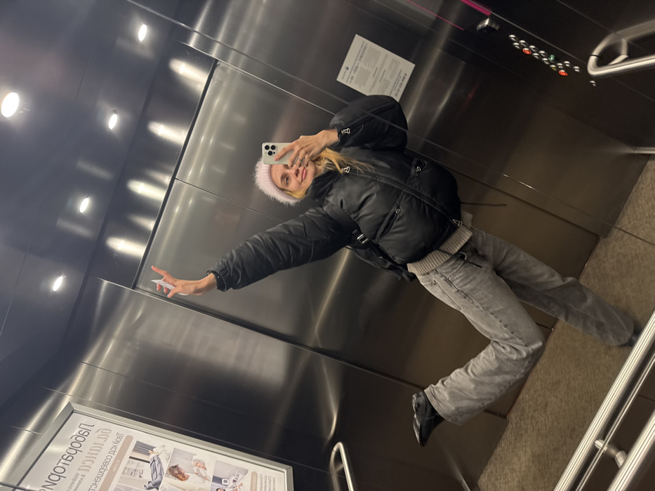 Inside an elevator, a blonde woman in a pink beanie, black puffer jacket, and grey jeans takes a selfie with her phone