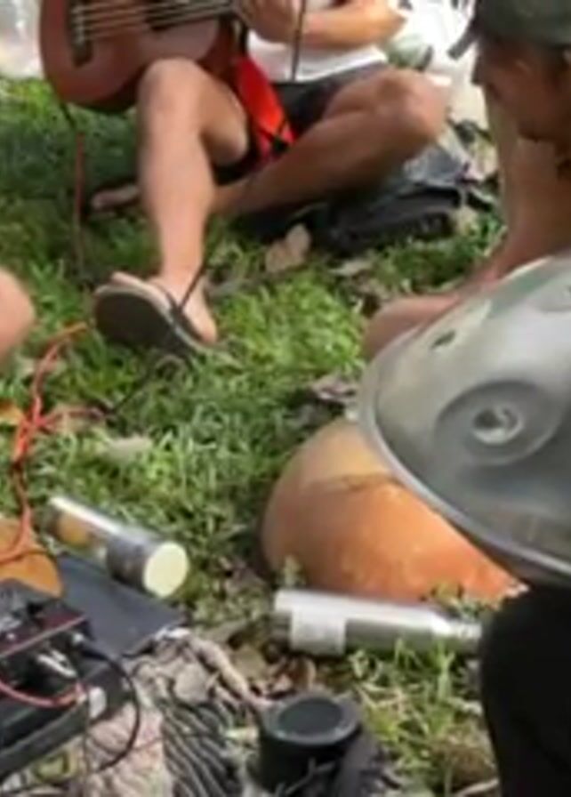 The scene unfolds on a grassy lawn where a group of people are seated in a circle, engrossed in playing musical instruments. In the foreground, a person plays a silver-colored handpan, the instrument resting on their lap. To the left, another individual is focused on playing a wooden flute. Sitting in the background is another person with a small, wooden stringed instrument. An electronic mixer sits on the ground with a microphone on a stand, along with various other items. The setting is a casual outdoor gathering, bathed in natural light.