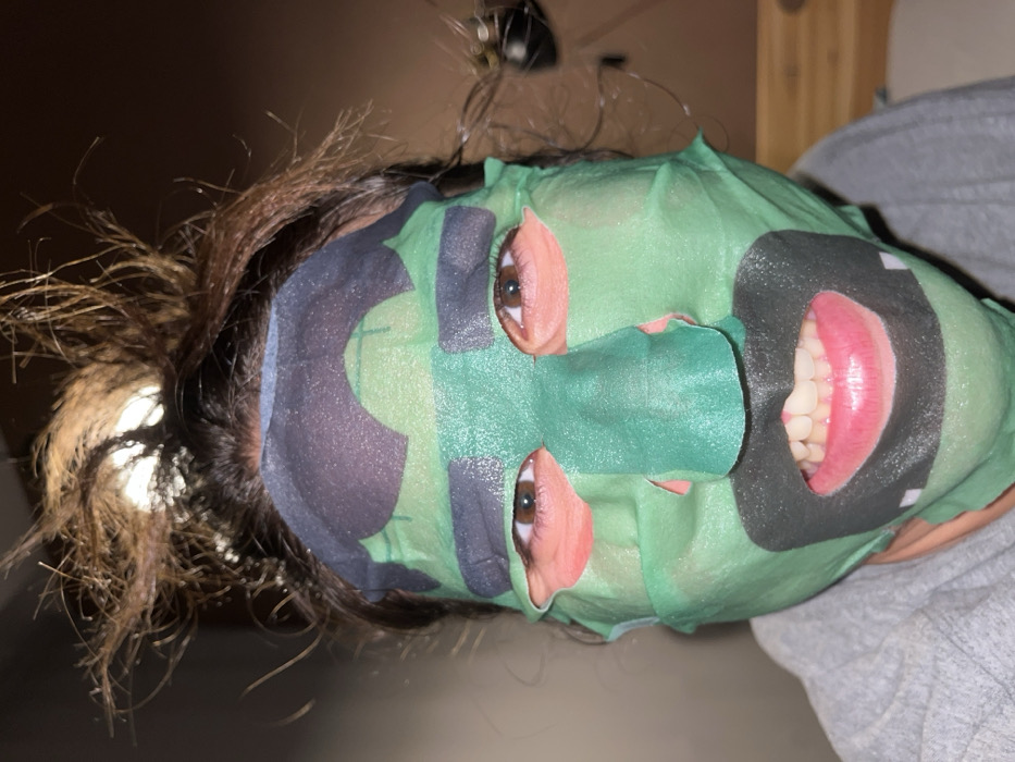 A frontal close-up photograph depicts an individual located in the Capital City of Prague, Czechia, wearing a green sheet face mask patterned to simulate facial features