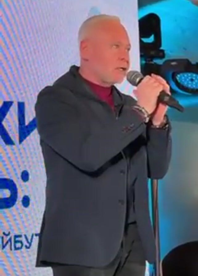 A man with short white hair is speaking into a microphone. He is wearing a navy blue blazer over a maroon turtleneck shirt and dark pants. He has a bracelet on his left wrist. He appears to be on a stage, in front of a screen. The screen has what appears to be white text and a blue design on a white background. A spotlight fixture is visible behind the screen. A chair is situated on the right side of the frame. The lower portion of some audience members is visible in the foreground.