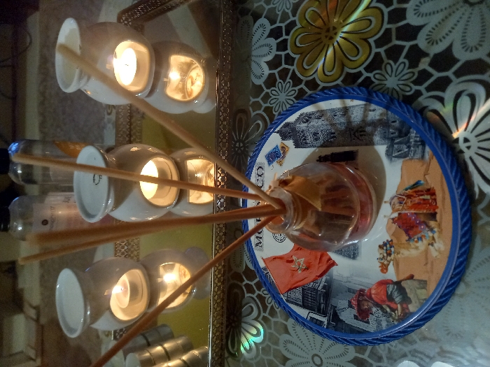 - "A decorative arrangement features two pairs of illuminated ceramic oil burners with wooden reeds extending towards a bottle containing a liquid substance on a round, illustrated tray with a blue rim" by FM-MtLfs2, licensed under CC BY 4.0