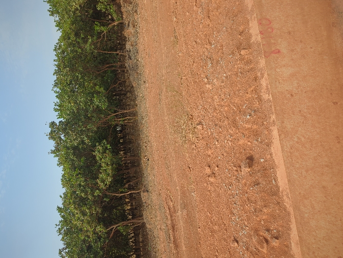 The image displays an outdoor scene in Karsana 2, Nigeria, under a clear, light blue sky with minimal cloud cover. The foreground consists of reddish-brown, unpaved terrain, likely lateritic soil, scattered with small rocks and sparse dry vegetation. A horizontal, light-colored concrete or cement barrier occupies the bottom portion of the frame, upon which red markings "8:30" are visible on the right side. Behind the barren ground, a dense line of medium-sized trees with full green foliage forms a natural backdrop across the midground, extending into the background. The trees exhibit visible, slender trunks and are closely spaced, forming a continuous vegetative screen. No individuals, animals, or specific activities are present within the captured scene.