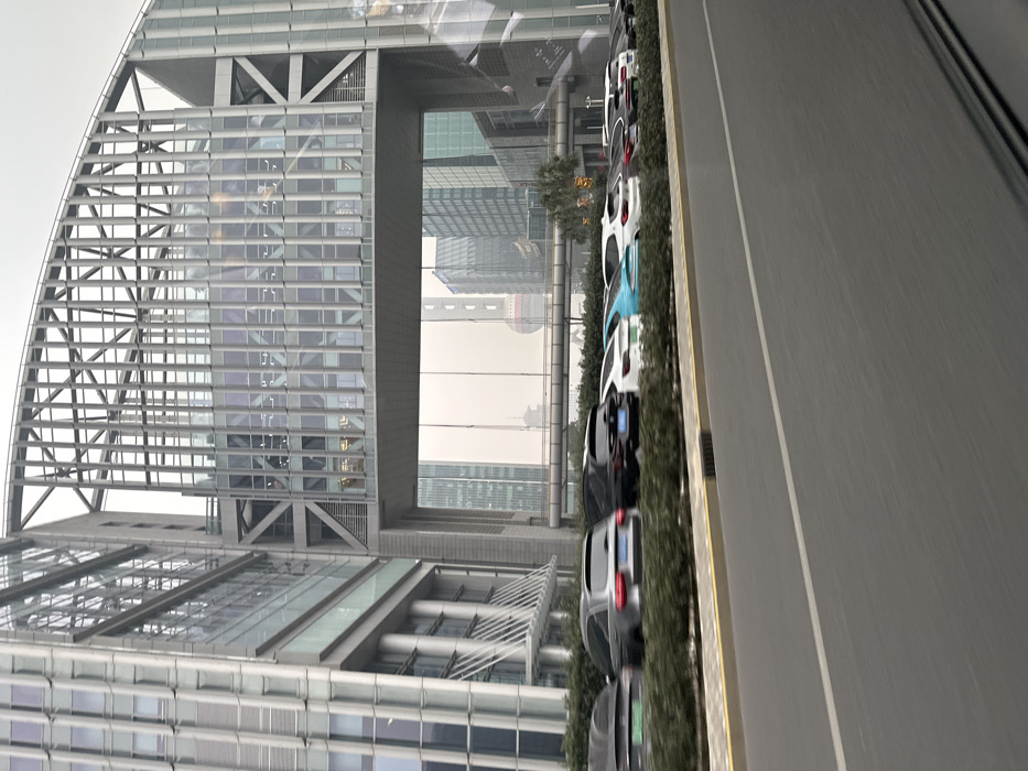 A modern architectural marvel dominates the view, featuring a unique structural design with interconnected geometric patterns and reflective glass surfaces. Alongside the building, a row of parked vehicles lines a narrow strip of greenery bordering a gray road. The perspective suggests a high-angle shot, emphasizing the building's height and the linear arrangement of cars. The sky is overcast, contributing to a muted color palette.