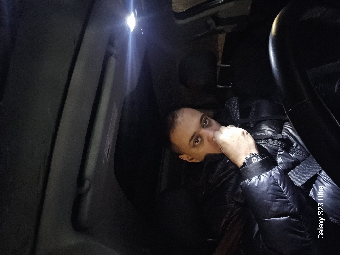A man sits inside a car, visible from the chest up. He wears a shiny black puffer jacket and a watch on his left wrist. His hand is near his mouth as he looks at the camera. A steering wheel is visible on the right side. The interior is dimly lit by the car's overhead light. Part of the car's interior panel is on the left, along with the watermark "Galaxy S23 Ultra" on the bottom right.