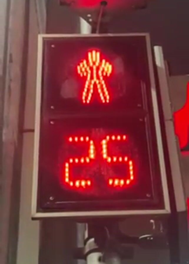 pedestrian crossing signal. The signal displays a red figure of a walking person and the number 26. The number counts down to 24 as the video progresses. The signal is mounted on a grey pole. The video is shot at night and there is some ambient noise in the background.