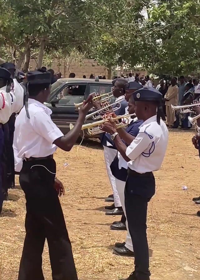 A brass band is playing in front of a crowd of people. The band members are wearing uniforms. Some uniforms are navy blue and white, while others are white and black. They are playing various brass instruments, including trumpets and a tuba. The crowd is standing around, watching the band play. The environment appears to be a grassy area, possibly a field or park. A dark-colored sedan is parked behind the band. One man in the band seems to be directing the others, while others in dark slacks instruct and inspect the performers.
