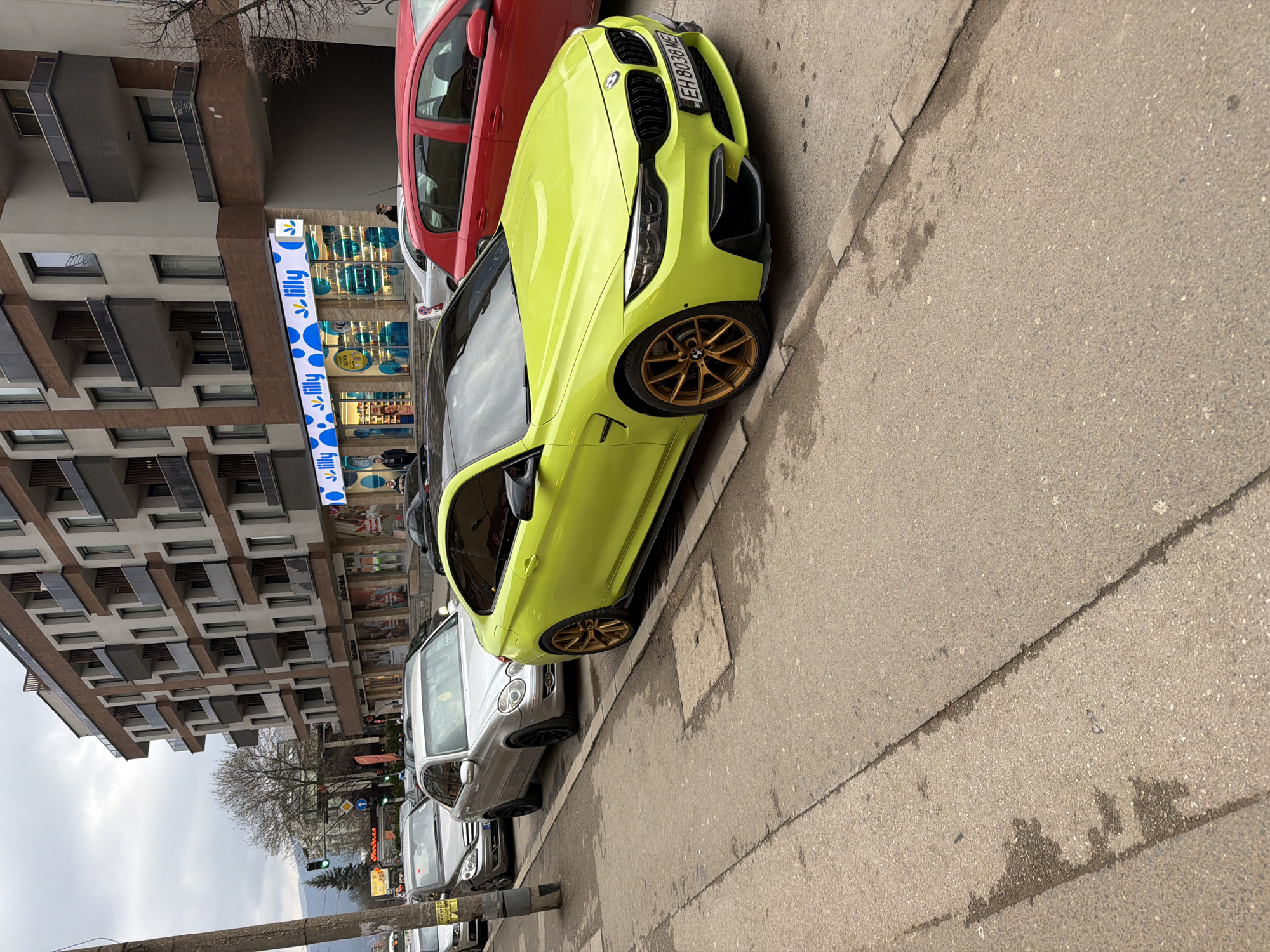 The image displays an urban street scene on a cloudy day at 100 Cherni Vrah Blvd, Hladilnika, Sofia, Bulgaria. In the immediate foreground, a vivid lime green (or "acid green") BMW M4 Coupe (F82) with a black roof, black aerodynamic front bumper elements, and bronze multi-spoke alloy wheels is parked facing right on asphalt pavement, adjacent to a concrete curb. The vehicle's Bulgarian license plate reads EH 8038 ME. Behind the BMW, a red hatchback is parked, followed by a silver Mercedes-Benz E-Class (W211) sedan with black wheels, and then a dark gray Mercedes-Benz B-Class (W245). The asphalt shows visible cracks and dark, wet patches on the left. The background features a multi-story building with a modern architectural style, characterized by light beige and brown facade panels and numerous balconies equipped with glass railings. The ground floor of this building hosts commercial spaces, most notably a "Lilly Drogerie" store with a prominent blue and white signage, and a "BioFresh Market" partially visible to its left. Several pedestrians are observed near the entrances of the "Lilly Drogerie," appearing to enter or exit the establishment. On the far left, a dark utility pole stands in the foreground. Further down the street, a green traffic light is visible amidst bare deciduous trees and some evergreen foliage. A distant mountain range is discernible through the overcast sky, completing the urban panorama.