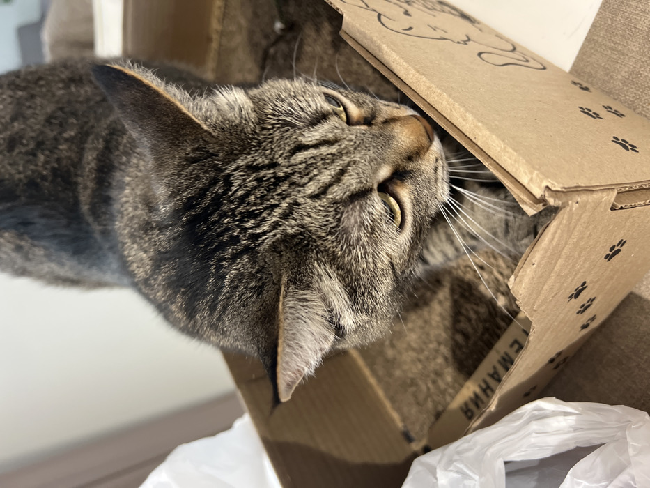 - "A gray tabby cat is nestled inside a brown cardboard box" by FM-mWrWX2, licensed under CC BY 4.0