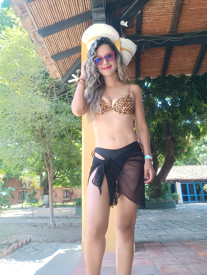 The image displays a female individual standing outdoors in La Victoria, Venezuela, during daylight hours. The subject is positioned centrally, facing the camera with a smile, and has long, wavy, multi-toned hair. She is wearing pink-framed sunglasses, a leopard-print bikini top, and a black sheer sarong tied over black bikini bottoms. A light-colored bracelet is visible on her left wrist, and a blue and white identification band is present on her right wrist. Her left hand is raised, touching the temple area near her sunglasses. She stands on a light-colored tiled surface, adjacent to a yellow pillar. This pillar supports an overhead structure featuring dark wooden beams and a brown tiled or thatched roof. A white security camera is mounted on one of the wooden beams directly above the subject. The background consists of abundant green trees and foliage, with several single-story buildings visible in the distance. These buildings have brown tiled roofs and light-colored walls; one structure distinctly features blue-framed windows. The ground transitions from the tiled area to a sandy or dirt surface bordered by low brickwork.