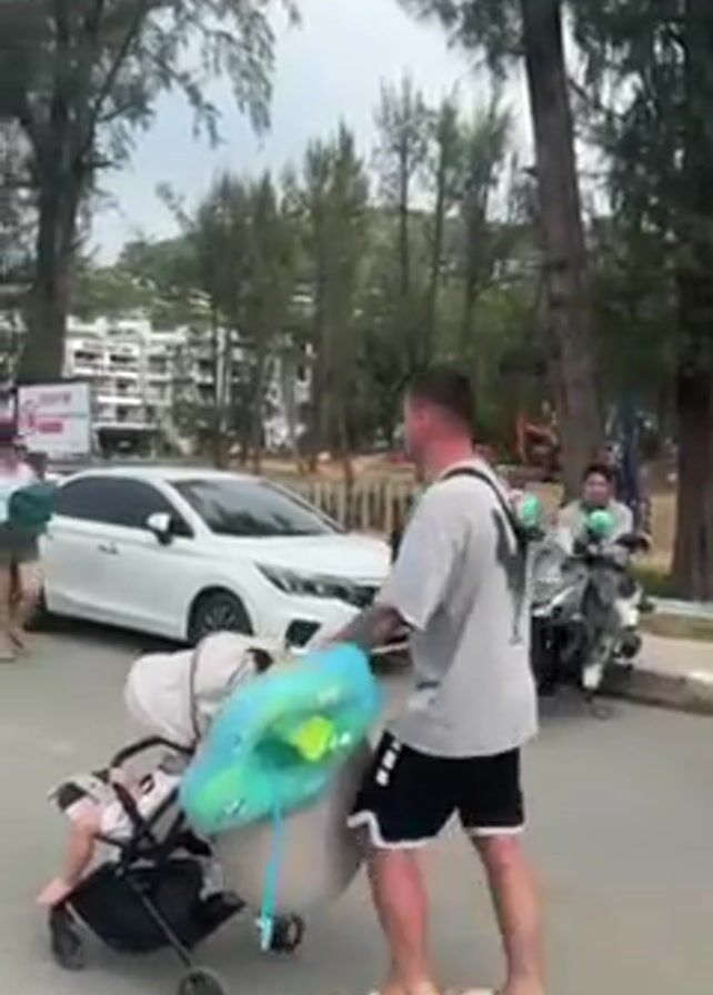 A man in a gray t-shirt and black shorts pushes a stroller across a road. In the stroller is a small child. A green and blue inflatable float is attached to the back of the stroller. A white car is parked on the side of the road. There are trees on either side of the road, and a building can be seen in the background. Several people are walking in the same direction as the man with the stroller. A man is sitting on a motorcycle nearby.