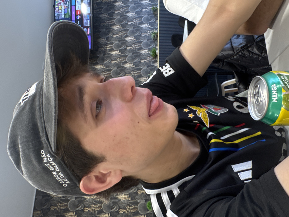 An image taken indoors in Mirandela, Portugal, features a young male subject seated at a light-colored table, looking towards the right with his tongue partially extended