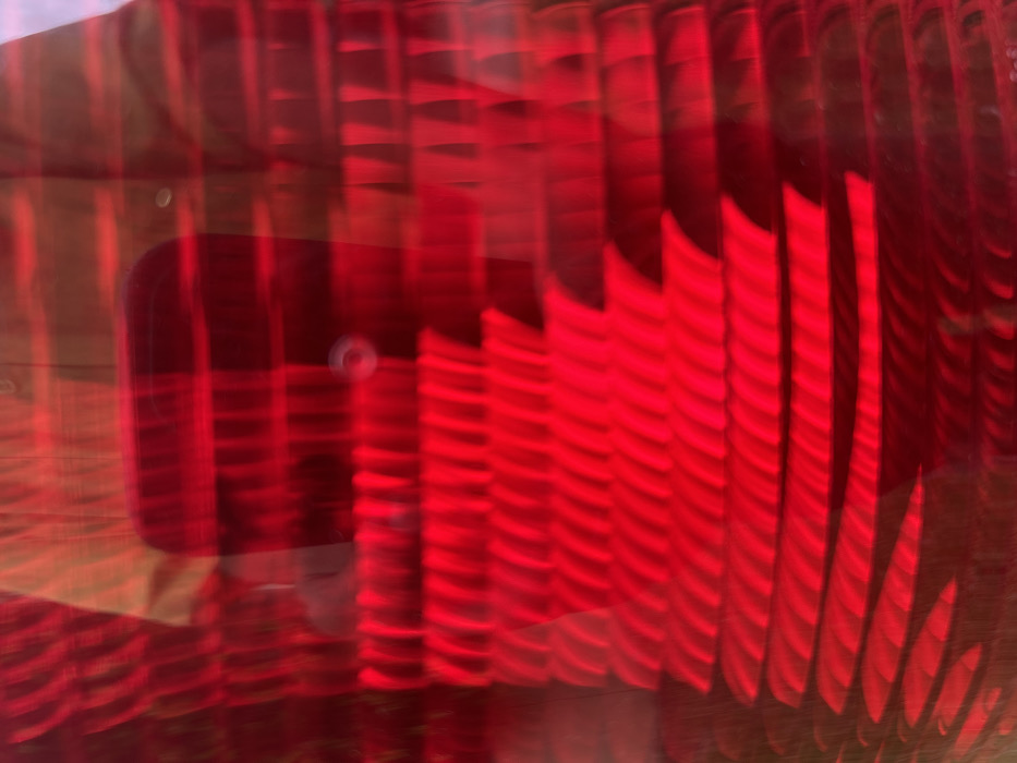 blurry, predominantly red abstract pattern. A vague shape resembling a phone is visible, along with a person's reflection or presence behind the device. The red areas appear to be composed of numerous vertical lines with sharp edges, possibly reflecting a structured surface. The overall scene has a chaotic and unclear quality due to the blur.