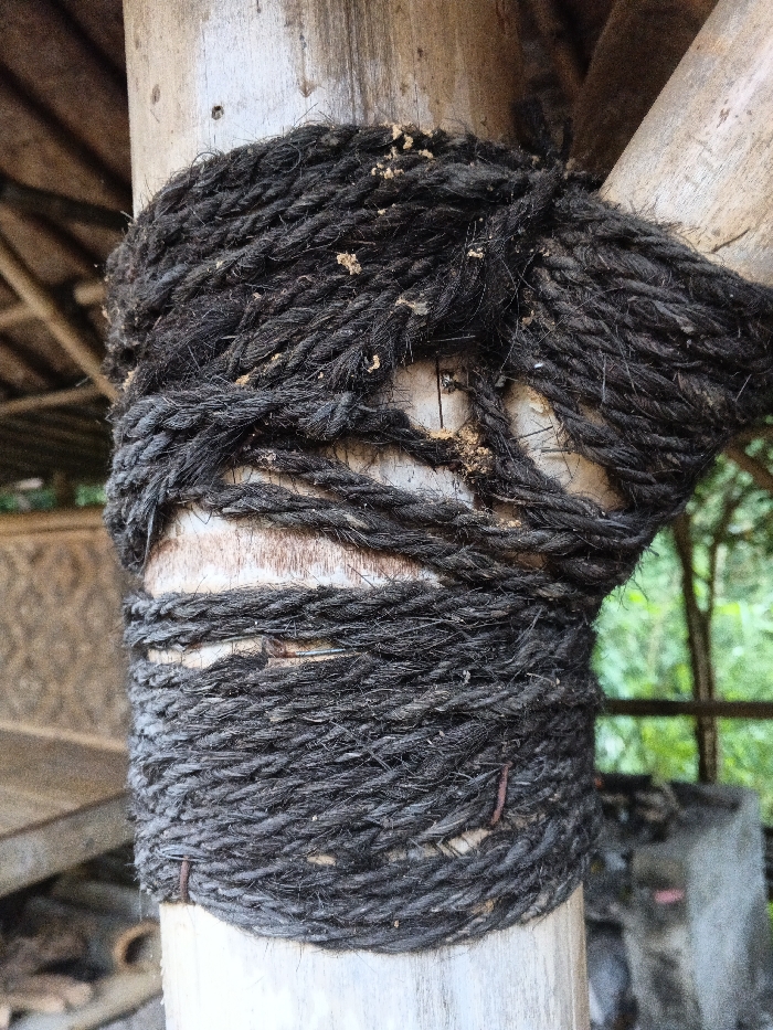 In Kyauk Hsoke, Myanmar, a vertical, light-colored wooden or bamboo post is centrally depicted, tightly bound by multiple wraps of thick, dark, coarse natural fiber rope. The rope exhibits a fibrous, worn texture with scattered lighter, possibly organic, particulate matter. The binding secures the main vertical post to at least one other diagonal wooden or bamboo support, visible entering the frame from the upper right. To the left of the main post, a rustic structure with a woven texture and a thatched roof element is partially visible, alongside a flat wooden surface. To the right, green foliage and additional timber or bamboo structural elements are present against a bright background, with a concrete or stone block partially visible at the lower right. The scene is illuminated by diffused natural light.