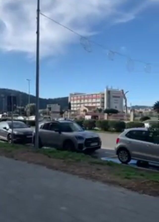 n urban street scene. The camera pans from left to right. It showcases a row of cars parked along the street, a shopping center in the background, a modern church with two towers, and apartment buildings. The sky is blue with scattered clouds. The street is paved with gray bricks, and there are trees and shrubs along the roadside. There are also trash receptacles.