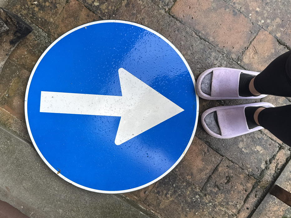 An overhead view captures a detached blue circular traffic sign with a prominent white downward-pointing arrow, resting on an uneven, weathered reddish-brown brick or cobblestone pavement. The sign's surface displays numerous small water droplets, indicating moisture. Positioned directly below the sign are two human feet, clad in light purple slide sandals worn over dark grey socks, with black leggings visible. A grey concrete curb is present along the upper-left edge of the frame. This scene is observed in Cortona, Italy.