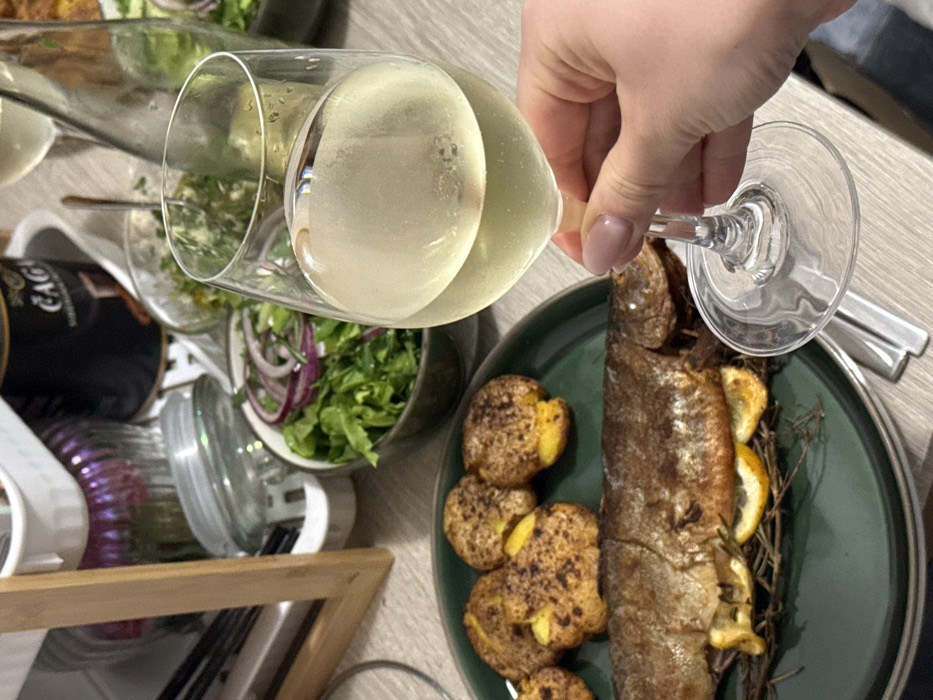 The image depicts an indoor dining scene on a light-colored wooden or laminate tabletop in Hainburg an der Donau, Austria. In the foreground, a left hand with manicured light pink nails holds the stem of a clear wine glass containing a pale yellow-green liquid, indicative of white wine, with condensation present on the glass exterior. Dominating the midground is a dark green circular plate featuring a whole roasted fish, likely a trout, positioned horizontally. The fish exhibits a browned, crisp skin. Beneath it, a bed of lemon slices and dark green herb sprigs, possibly rosemary, is visible. To the upper left of the fish are five irregularly shaped, golden-brown roasted potatoes, consistent with smashed or crushed potatoes, some displaying darker seasoning. In the background, a light-colored, possibly wooden and white, shelving unit is partially visible on the left. On the table, to the left of the main plate, a small, dark bowl holds a green salad with distinct red onion slices. To the right, another small bowl contains a green, finely chopped herb mixture or sauce. Behind the wine glass, a clear glass carafe or bottle with a narrow neck is partially visible. Further back, a dark cylindrical container labeled "CAG" can be seen on the shelf. The overall environment suggests a prepared meal being consumed.