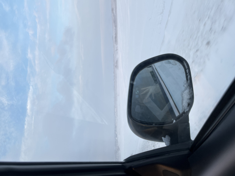 The image depicts a winter scene captured from the interior of a vehicle in Gostagaevskaya, Russia. The view primarily features a snow-covered landscape under a partly cloudy sky with light blue and grey tones. On the left, a dark-colored vehicle door frame and window pillar are visible. A black-framed side-view mirror, partially encrusted with snow and ice along its lower edge, is prominent in the mid-left. Reflected within this mirror is a person's hand, holding a white or light-colored smartphone, indicative of the photographer. The reflection also shows a portion of the vehicle's white exterior. Beyond the vehicle, a vast expanse of snow covers the ground, with faint tire tracks or a road visible to the immediate left. In the distance, a cluster of structures, likely buildings, marks the horizon, indicating the edge of the settlement. Further right, a line of snow-dusted vegetation or trees can be observed. The overall environment is characterized by cold, snowy conditions.