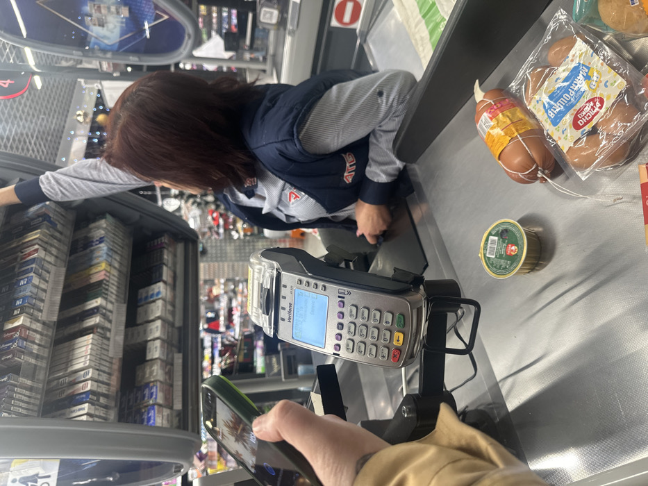 A cashier wearing a blue vest and striped shirt is working at a checkout counter. A customer is holding a smartphone, preparing to pay. On the conveyor belt are several food items: a package of sausages, another sausage, and a can of pate. A Verifone payment terminal is prominently displayed in the foreground. Stacks of items are visible near the checkout area.