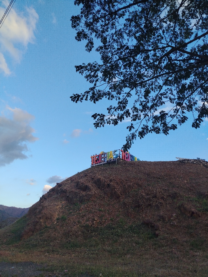 A hill rises against a blue sky with scattered clouds. A bare tree branch extends into the frame's upper right. On the hill's crest, large, colorful block letters spell out "TEBASCADILLO." The hillside is brown with sparse vegetation. The lower part of the image shows a grassy area and a hint of a road in the bottom left corner. Distant mountains are visible in the background.