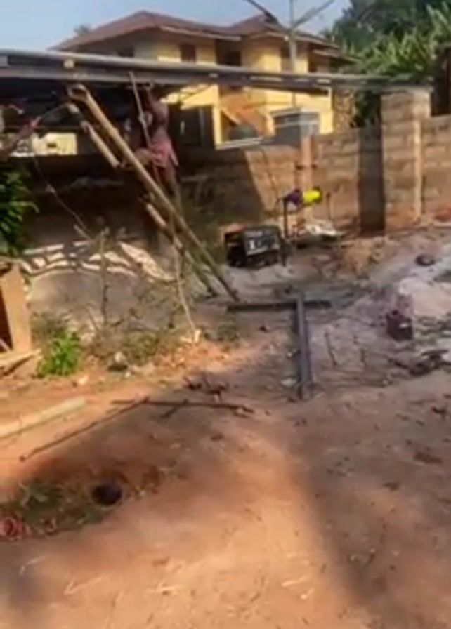 construction site in a yard. Two men are working on a metal structure, using wooden scaffolding and ladders to reach it. One man is cutting metal with a power tool, while the other appears to be assisting. A generator powers the equipment. The yard is cluttered with tools, metal scraps, and piles of sand. A brick wall forms a boundary, and a multi-story building can be seen in the background. The sky is blue with scattered clouds.