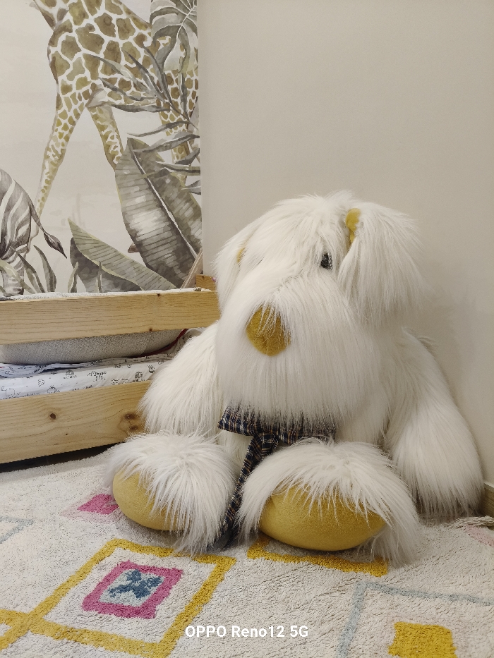 This image depicts a static indoor scene, likely a child's room, located in the city of Cuéllar, Spain. The central subject is a large, fluffy white plush dog toy, positioned facing forward and slightly to the right, sitting on a patterned rug. The toy features long white fur, a prominent yellow snout, small black eyes, and yellow inner ears. A dark blue and brown plaid bow tie is secured around its neck. To the left of the plush toy, a light wooden bed frame is visible, partially obscured. Within the frame, a grey cushion or pillow rests on a white fitted sheet adorned with small, dark patterned motifs, possibly depicting animals or abstract shapes. Directly behind the bed frame and extending upwards along the left wall is a decorative wall hanging or wallpaper. This design features a beige background with stylized botanical and animal patterns, specifically a giraffe's spotted neck in shades of brown and beige, and large green-brown tropical leaves, including elements resembling banana leaves. Faint zebra stripes are also discernible lower on the left. The floor is covered by a light-colored, possibly white or cream, textured rug. The rug displays a repeating geometric pattern consisting of squares and diamonds in yellow, pink, and light blue. The background wall is a solid light beige color, providing a neutral backdrop. The scene is illuminated by soft, diffused indoor lighting, casting minimal shadows. A watermark "OPPO Reno12 5G" is present at the bottom center of the image. No human figures are present.