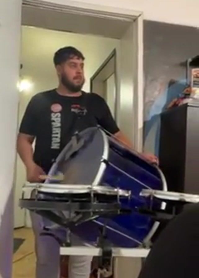 A man is playing a blue drum. He is standing in a doorway wearing a black t-shirt with the word "SPARTAN" on it and gray sweatpants. The drum is on a stand. There is a person sitting out of focus in the bottom right corner of the frame. The room the man is in appears to be a living room. The room visible through the doorway is brightly lit.