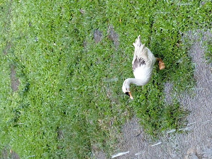 A goose stands on vibrant green grass near a gray concrete surface. Its white plumage is accented with patches of dark gray. The goose bends its long neck, its black beak touching the verdant ground. The composition is from an aerial perspective, showing the textures of the grass and concrete.