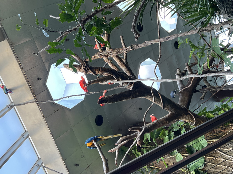 - "The image, shot from a low angle, depicts a tree with several red ibis perched on its branches under a glass ceiling" by FM-8yKDv2, licensed under CC BY 4.0