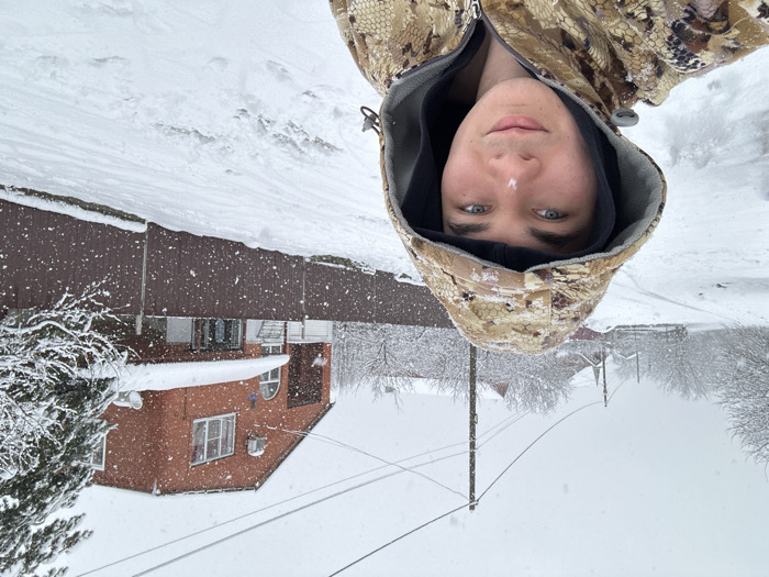 An image taken in Abinsk, Russia, depicts a snowy, overcast day. The foreground features a young male subject, approximately 18-25 years old, wearing a hooded, camouflage-patterned jacket and a dark beanie or inner hood. He has blue eyes and a small flake of snow rests on his nose. He is looking directly at the camera with a slight smile, indicating a selfie perspective. The scene is heavily covered in snow, with flakes actively falling. To the subject's left, a snow-covered dirt road or path extends into the distance, flanked by bare, snow-dusted trees. Utility poles with overhead wires run alongside the road. In the midground, to the subject's right, a two-story residential building constructed of reddish-brown brick is visible. The house features a snow-covered roof, white-framed windows (including an arched ground-floor window), an external air conditioning unit on the upper facade, and a satellite dish or similar antenna on the roof's edge. A dark brown solid fence runs along the property line in front of the house. To the far right, a snow-laden evergreen tree partially obscures the view. Additional snow-covered houses are discernible in the distant background.