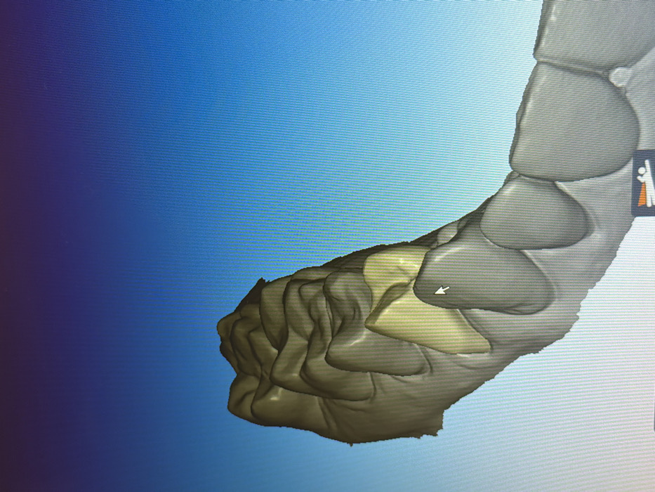 The image displays a digital 3D rendering of a human upper dental arch, consisting of molars and premolars, shown on a computer screen