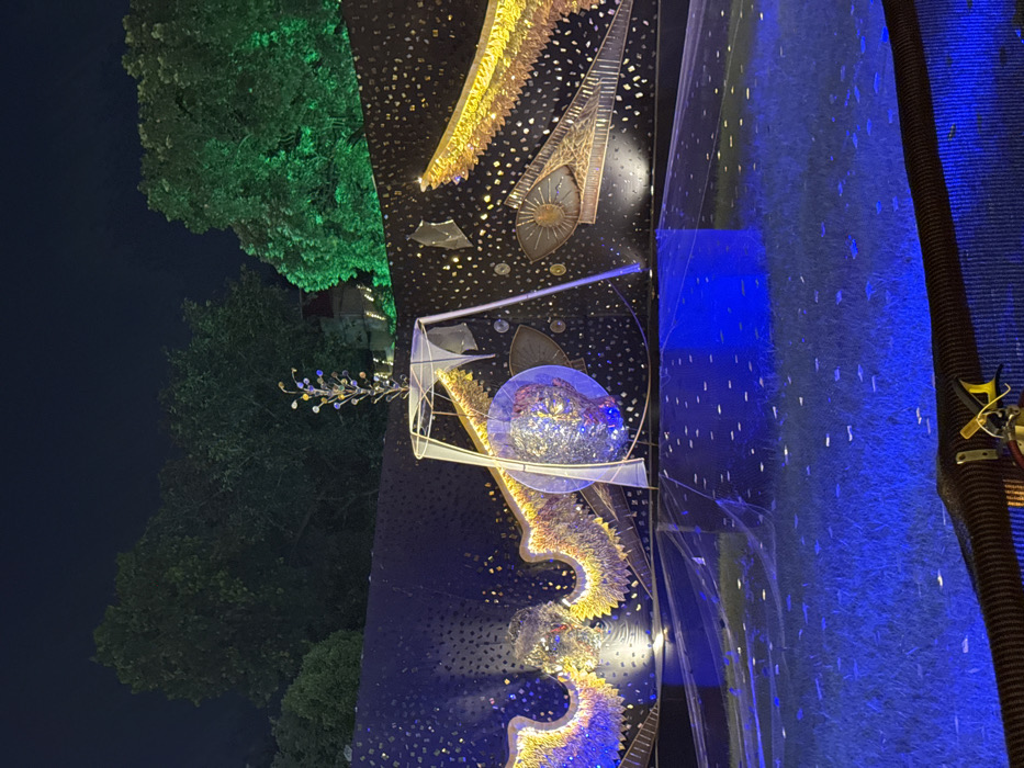 The image depicts an outdoor night scene in Bidhannagar, India, showcasing an illuminated art installation. The background features a dark sky above a line of dense trees; the trees on the right are intensely illuminated with green light. The primary subject is a large, dark, curved wall adorned with numerous small, reflective square elements that mimic stars or glitter. Prominent features on this wall include two large, symmetrical, wing-like or wave-like structures composed of golden-yellow metallic panels, illuminated by blue and purple lights. Various abstract and circular metallic forms, some resembling eyes or sunbursts, are integrated into the wall. In the center foreground of the installation stands a tall, abstract metal framework draped with translucent white fabric. Suspended within this structure is a large, reflective, spherical object, which is strongly illuminated with blue light. Perched atop the central framework is a smaller, stylized metallic sculpture resembling a plant or tree, adorned with small, colorful spherical elements in shades of blue, yellow, and clear. The ground in front of the installation consists of grass, intensely lit from below or front by blue lights, giving it a vibrant blue hue. A fine, dark netting or mesh is stretched over this blue grass, containing numerous small, reflective particles that catch the light. The immediate foreground shows a dark, corrugated barrier, possibly a fence or railing, with a small yellow object attached to it on the lower right. No individuals or specific actions are visible within the frame.