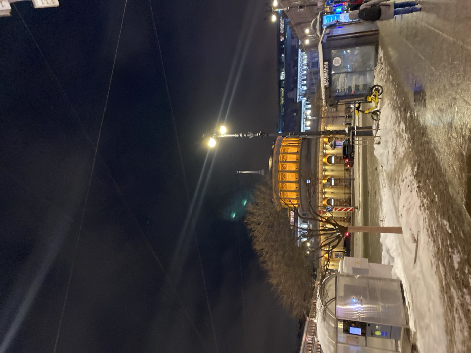A nighttime cityscape features a brightly lit, semi-circular building with architectural details. Bare trees line the street, illuminated by street lamps. A bus stop or information kiosk with a metallic sheen sits along the sidewalk. Patches of snow cover the ground. In the distance, a tall, slender spire rises. Power lines stretch across the dark sky. The scene is rotated sideways, emphasizing the verticality of the structures.