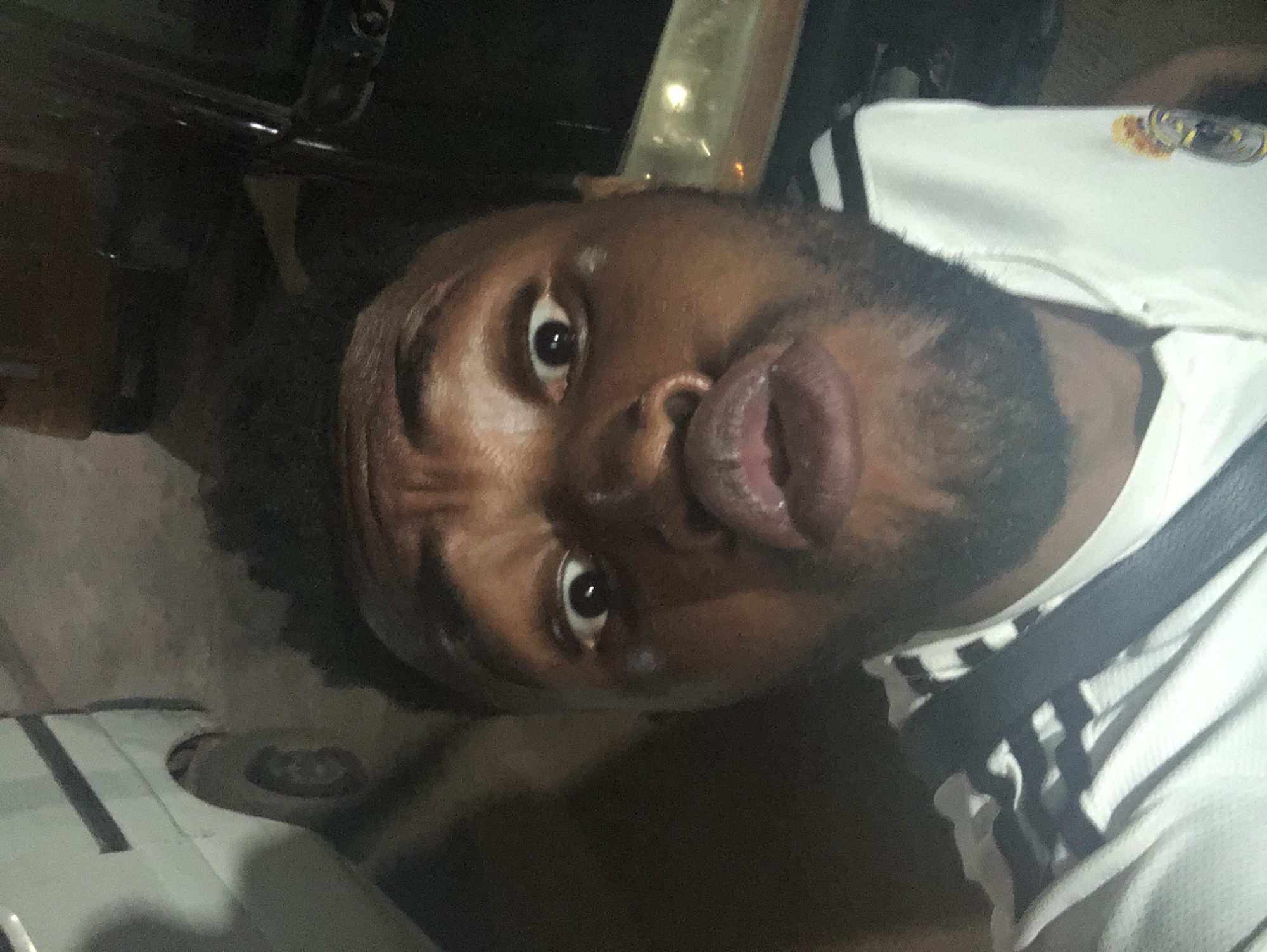 A low-angle, distorted close-up photograph shows an African-American male with dark hair and a beard. His eyes are wide open and he is protruding his lips. The environment appears dark, possibly outdoors at night, with a vehicle visible in the upper left corner. The man is wearing a white shirt with black stripes on the shoulder and a black strap. Location: Unknown, Unknown.