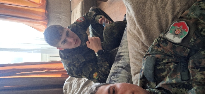 The image captures two males, appearing as young adults, dressed in camouflage uniforms consistent with Bulgarian military attire, located indoors within a room in Sofia, Bulgaria