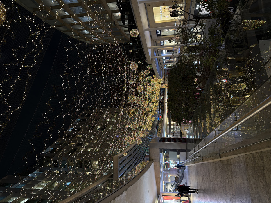 - "Illuminated strings and spherical lights decorate an upscale mall's open atrium" by FM-UY0xj2, licensed under CC BY 4.0