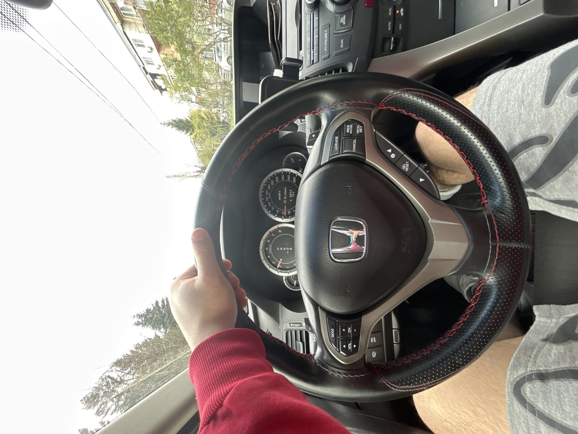 The image is taken from the driver's seat of a Honda car, looking out through the front windshield. A person's hand, wearing a red long-sleeved shirt, is gripping the steering wheel. A second person wearing gray shorts is in the passenger seat. The car's dashboard and central console are visible, with indicators and controls legible. Outside the window, a street is seen with buildings and trees, implying an urban environment. The city of Sofia, Bulgaria is not identifiable.