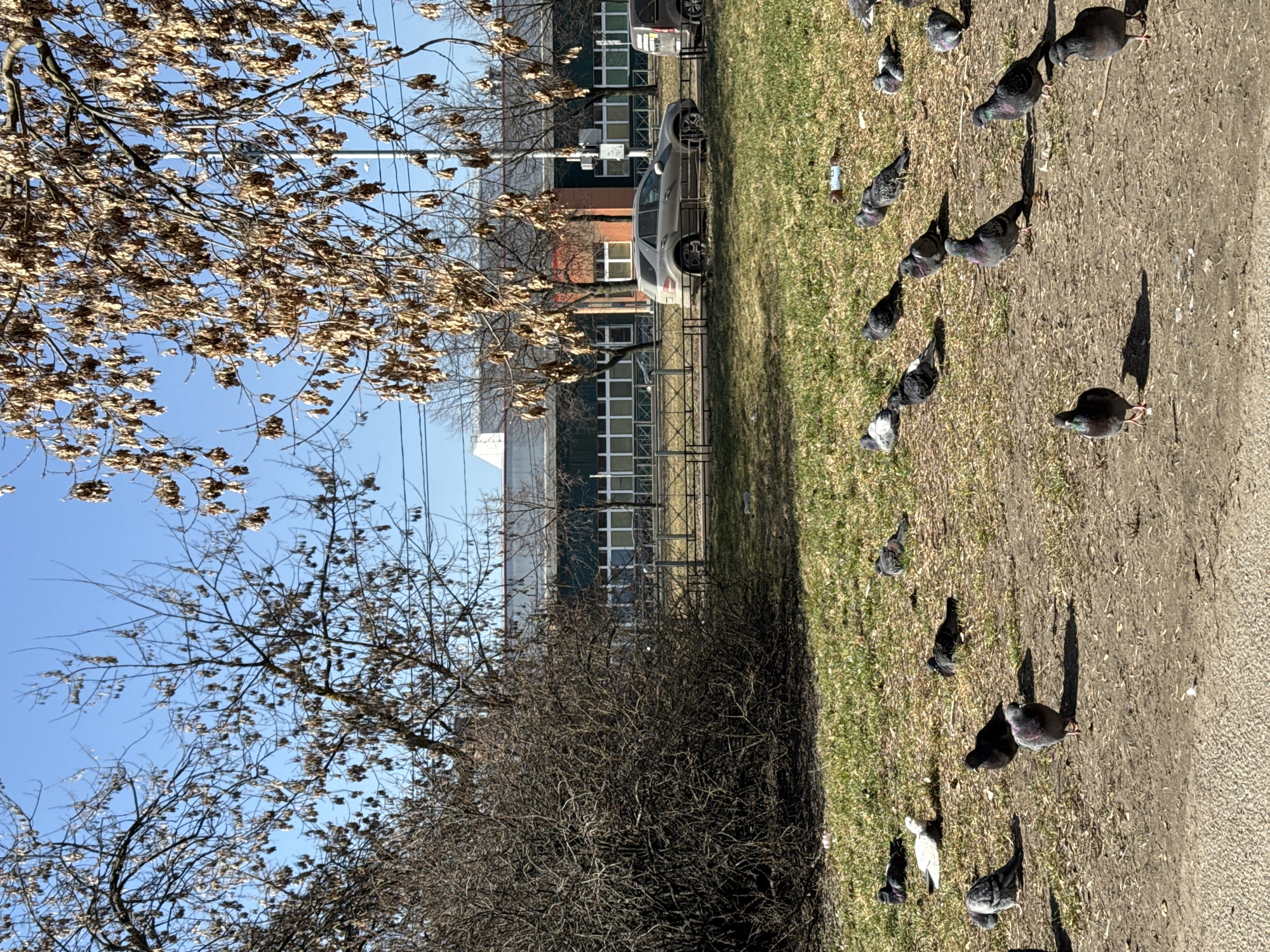 The scene depicts an outdoor urban green space in Saint Petersburg, Russia, on a clear, sunny day, likely during late winter or early spring. The precise location within the city cannot be determined from the visual information alone. In the foreground, the ground is a mix of bare, light brown earth and patchy, sparse light green grass, with scattered dry leaves and a few pieces of litter, including a blue plastic bottle. Approximately 25-30 rock pigeons (Columba livia domestica) are distributed across this area, mostly resting or standing. Their plumage varies, with predominantly gray birds featuring iridescent neck feathers, one white pigeon, and several darker individuals. A concrete or asphalt surface is partially visible at the bottom edge. The midground features a large, dense, leafless bush on the left. Several deciduous trees with bare branches, some retaining dried brown seed pods or leaves, are visible. A dark-colored metal fence with a decorative, repeating pattern runs horizontally, separating the green space from a paved road beyond. In the background, a two-lane paved road is visible, with parked vehicles on its far side, including a light-colored SUV and a dark van. Beyond the road, multi-story industrial or commercial buildings with dark corrugated siding, numerous windows, and a distinctive reddish-orange brick section are present. The buildings have flat or low-pitched roofs. Overhead utility lines and a street light pole are visible against a bright, cloudless blue sky. No human subjects are visible in the scene.