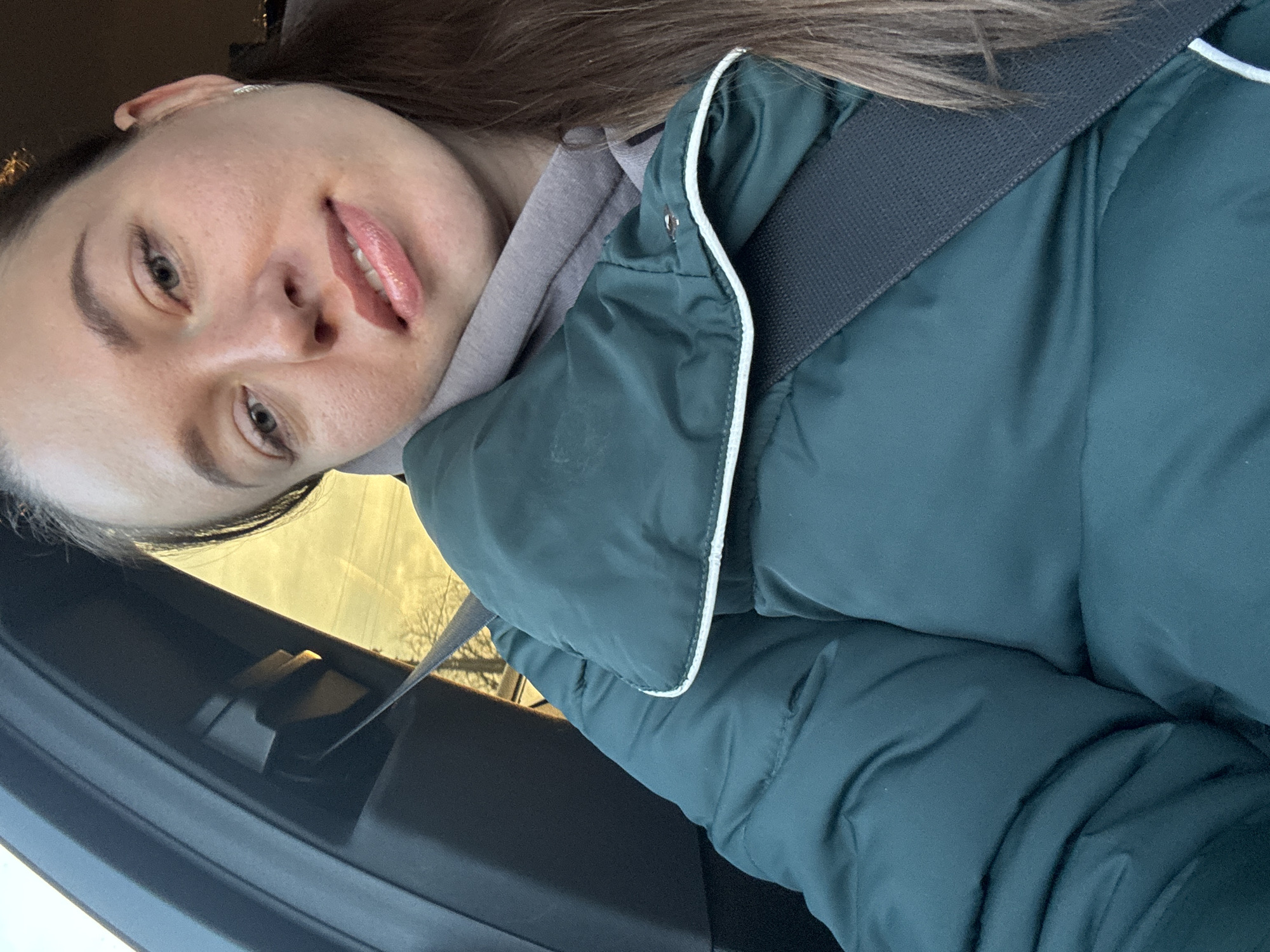 A female individual is depicted in a close-up, chest-up shot, seated within the interior of a vehicle. Her head is slightly tilted, and she is looking directly at the camera with a subtle smile, her lips parted to reveal a portion of her upper teeth, coated with a glossy pink product. She has fair skin, light-colored eyes, and light brown hair falling over her right shoulder. She is wearing a dark teal puffer jacket with a white trim around the collar, layered over a grey hooded sweatshirt. A dark grey fabric seatbelt is positioned diagonally across her chest and left shoulder. A small, circular, silver-colored earring is visible on her right earlobe. The vehicle's interior features dark-colored paneling. Through the out-of-focus window behind her, a golden-toned sky with silhouetted bare tree branches is visible, consistent with a low sun angle. The image contains no discernible visual information to confirm the specified location as the city of Горный, Russia.