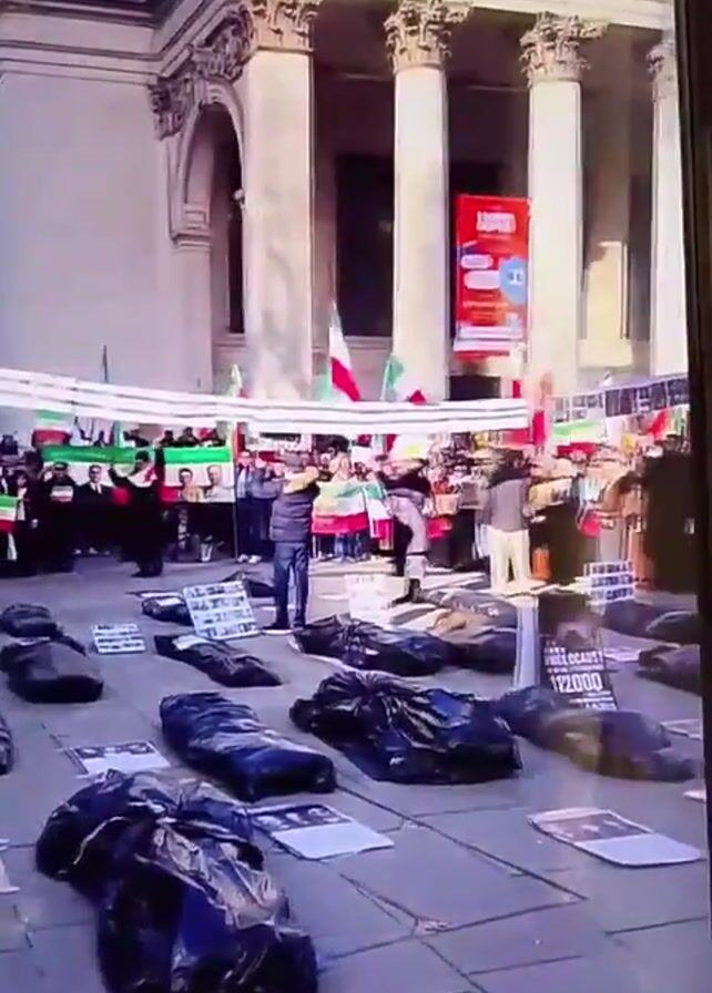 demonstration outside a building with pillars. A crowd of people are standing behind a row of black bags, some of which have papers around them. The people are holding signs and flags, some of which appear to be Iranian flags. One sign reads "12000". The building is made of light-colored stone and has windows on the upper floors. The sky is blue.
