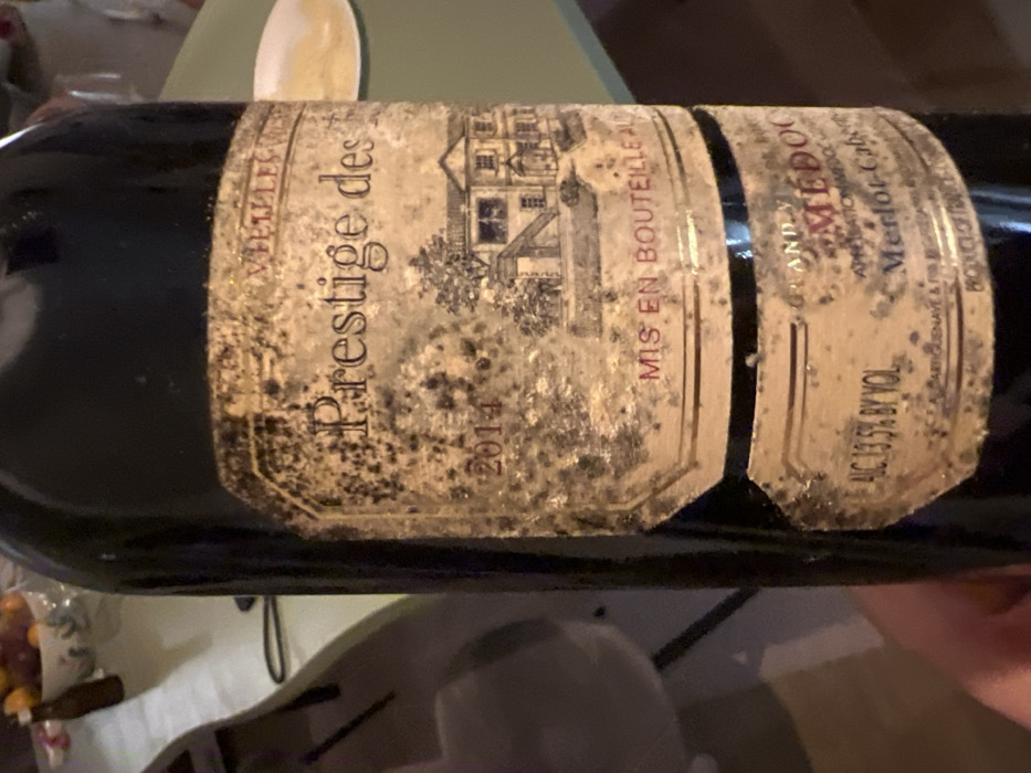 A dark-colored glass wine bottle is held upright in the foreground by a human hand, with fingers partially visible at the bottom left. The bottle's label, appearing aged and soiled, displays extensive white and dark speckling. Visible text on the label includes "Prestige des," "2014," "GRAND VIN DE MEDOC," "Merlot-Cabernet," and "ALC. 13.5% BY VOL," alongside a graphic depiction of a multi-story building resembling a château, flanked by trees. The background is significantly out of focus, revealing a light green surface, likely a tablecloth or placemat, on the right side. On this surface, a white, oblong dish contains a small quantity of a yellowish, granular substance. Further to the upper left in the blurred background, a white bowl filled with various fruits, including oranges, and a small dark bottle are visible on a lighter-colored surface. A dark, reflective object is partially observed on the left side of the background. The specific location within the city of Cachan, France, cannot be determined from the provided image.