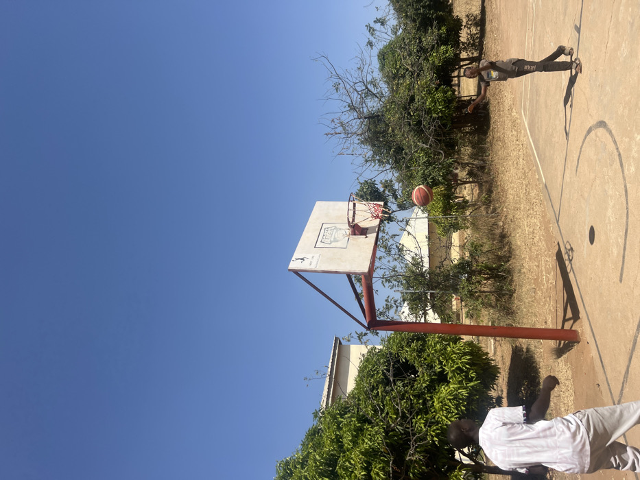 The image depicts an outdoor basketball court scene in Bukuru, Nigeria, under a clear, cloudless blue sky