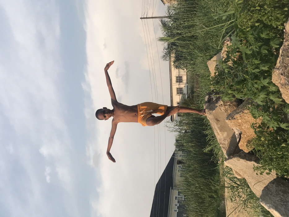 A young boy stands on a large rock outdoors, under a partly cloudy sky. He wears yellow shorts and poses with arms outstretched, appearing to balance. Lush green vegetation surrounds the rock, with buildings visible in the background. A utility pole is also visible in the distance. The photo is rotated 90 degrees.