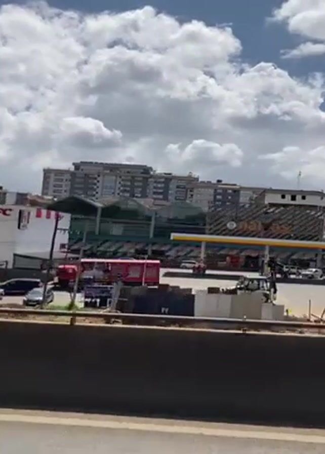 The video captures a scene of a bustling city intersection, likely in Africa. Shot from an elevated position, perhaps a bridge, the view encompasses a lively crossroads with moderate traffic including cars, small trucks, and buses. Pedestrians are seen crossing the street at various points. A prominent KFC restaurant is visible to the left, followed by a Shell gas station at the intersection's corner. Buildings of varied heights surround the intersection, some appearing as commercial or residential complexes. Above, a bright sky with numerous white clouds provides a dynamic backdrop to the urban landscape.