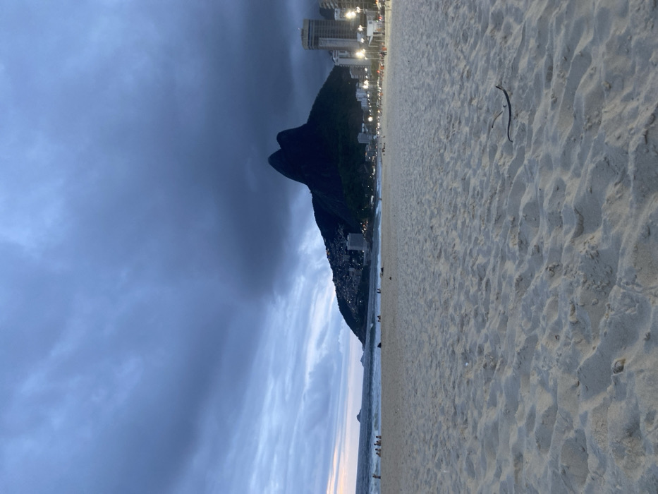 A beach landscape is depicted. A dark, mountainous landform dominates the middle ground, abutting a densely populated coastline with illuminated buildings. The sky is overcast, with muted blue and grey hues. The foreground shows a sandy beach texture. The image is vertically oriented.