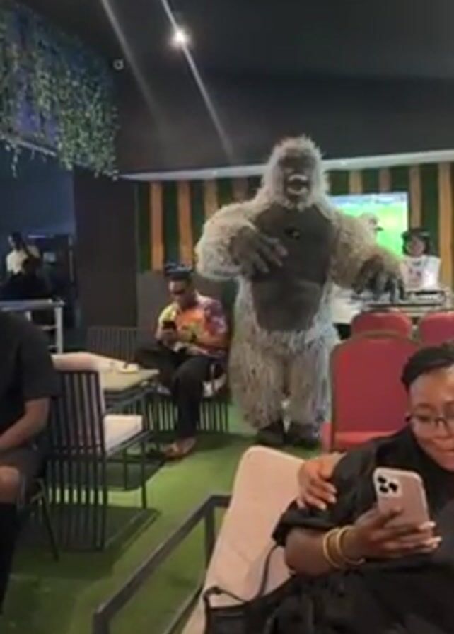 person in a gorilla costume in a semi-outdoor restaurant or bar. The person in the costume has a gray, furry suit with a black chest, hands, and face, with an open mouth. The costume’s facial features appear exaggerated. The person is dancing and moving their arms around while standing near patrons sitting on sofas and chairs. The patrons are looking at their phones and watching the person in the costume. There are tables and chairs surrounding the patrons. A TV screen can be seen in the background. Artificial plants and a green wall decoration are also visible.