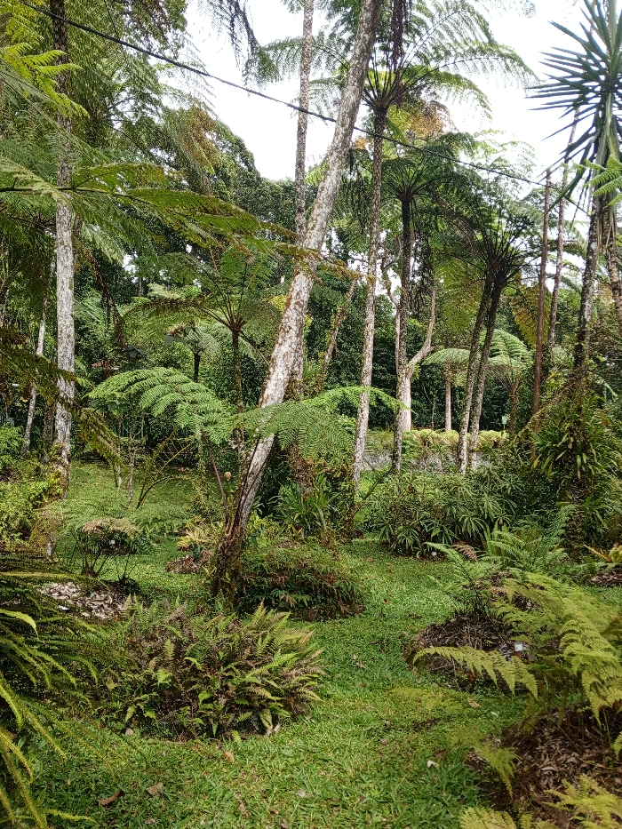 The image depicts a dense, lush green tropical landscape, identified as being within the Bà Nà Hills Nature Reserve in Đà Nẵng, Vietnam. The scene is dominated by numerous tree ferns (likely *Cyathea* species) with large, dark green fronds forming a multi-layered canopy and undergrowth. Several tall, slender trees with distinctly light-colored, mottled grey and white trunks are interspersed throughout the foliage. The ground is covered by various smaller ferns and patches of bright green grass, appearing uneven and natural. In the upper central portion, two thin, dark horizontal lines, consistent with overhead wires, traverse the image against a backdrop of bright, diffused light and dense tree canopy. In the mid-ground, a faint, light-colored structure, possibly a wall or pathway edge, is partially visible through the dense vegetation, suggesting a managed or developed area within the natural environment. No individuals, animals, or specific objects of human origin other than the potential wires and distant structure are visible. The lighting is soft and diffused, indicating an overcast sky or deep shade within the forest.