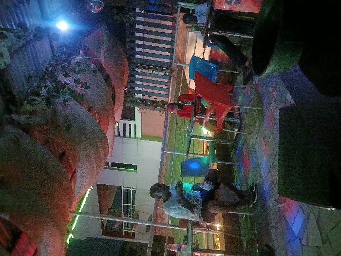 The scene depicts an outdoor evening gathering in Bir Teda, Chad, likely a lounge or bar area. Three dark-skinned males are seated at individual tables. In the foreground left, a male in a light t-shirt and dark shorts sits, holding a glowing green object. To his right, a male in a red top and red cap is seated at a table with a green bottle present. Further right, a third male in a light shirt and dark trousers is partially visible, also seated at a table. The ground is a tiled surface, illuminated by projected colored lights (red, blue, green). Overhead, light-colored fabric drapes cover the area, interspersed with artificial green foliage. A bright blue light source is visible in the upper right. A low metal railing separates the seating area from a multi-story building with white walls and dark accents in the background. A striped fence is also visible behind the railing. A dark green tub is partially visible in the bottom right corner of the frame.